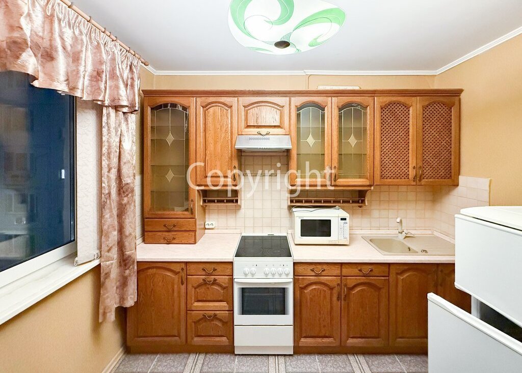 Кухня 8.8 м2: кухонный гарнитур, стол, стулья, электрическая плита на 4 конфорки с духовым шкафом, вытяжка, двухкамерный холодильник, микроволновая печь, телевизор.