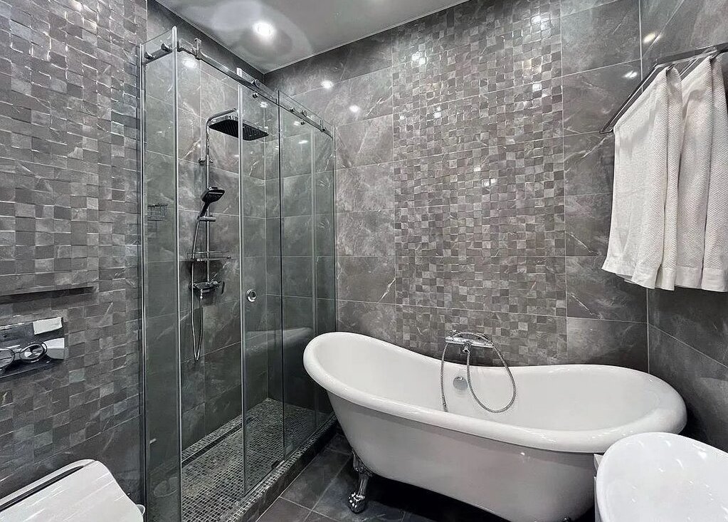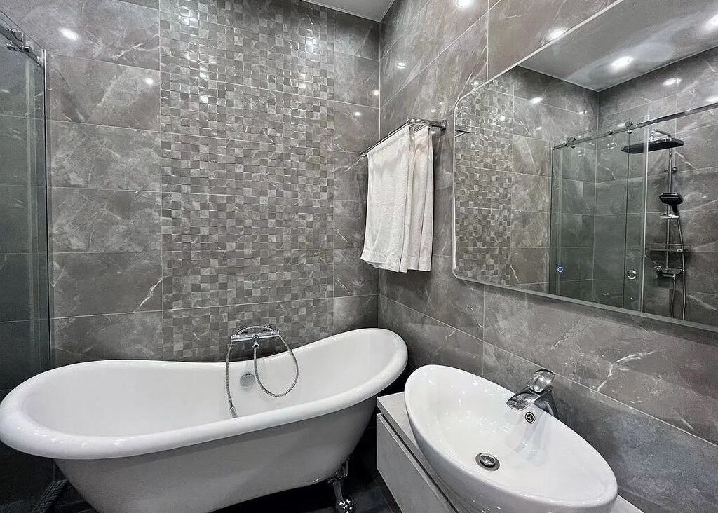 Ванная комната выполнена с использованием качественных материалов и оснащена современной сантехникой. Здесь есть ванна, душ, раковина и умное биде.