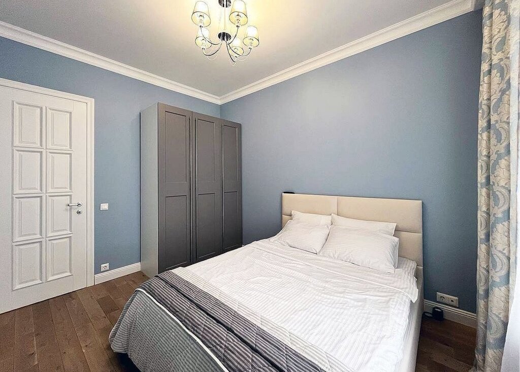 Спальня оформлена в спокойных тонах, создающих атмосферу уюта и расслабления. В ней находится большая двуспальная кровать, вместительный шкаф. Большое окно наполняет комнату светом, а мягкие текстильные элементы добавляют комфорта. Шторы блэкАут помогут выспаться.