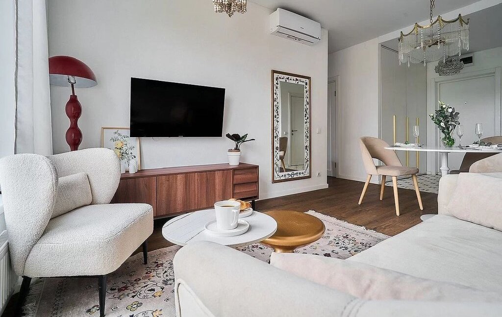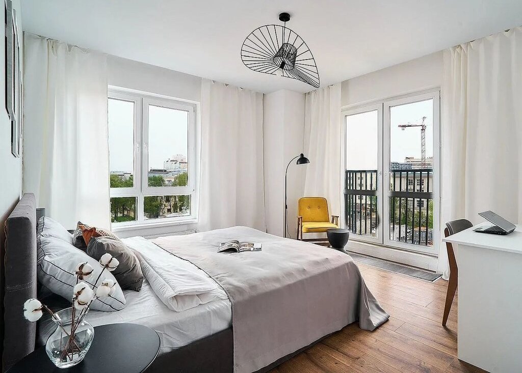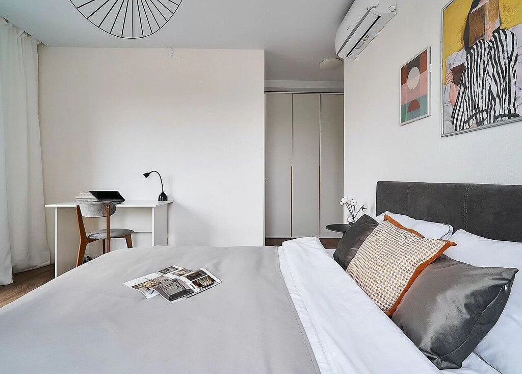 Первая спальня с телевизором, стильным шкафом и рабочим/ косметическим столом, так же стоит зеркало в полный рост.