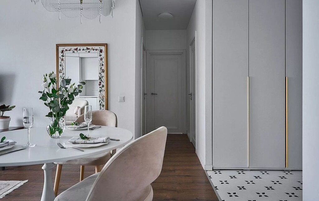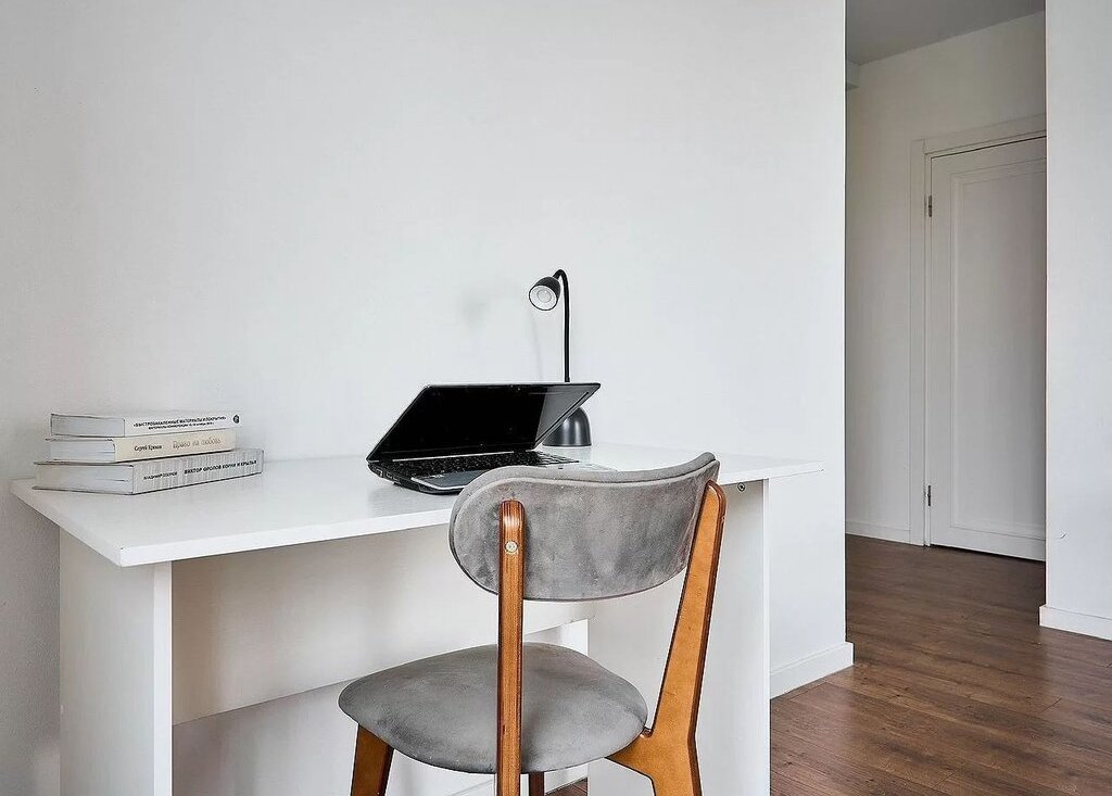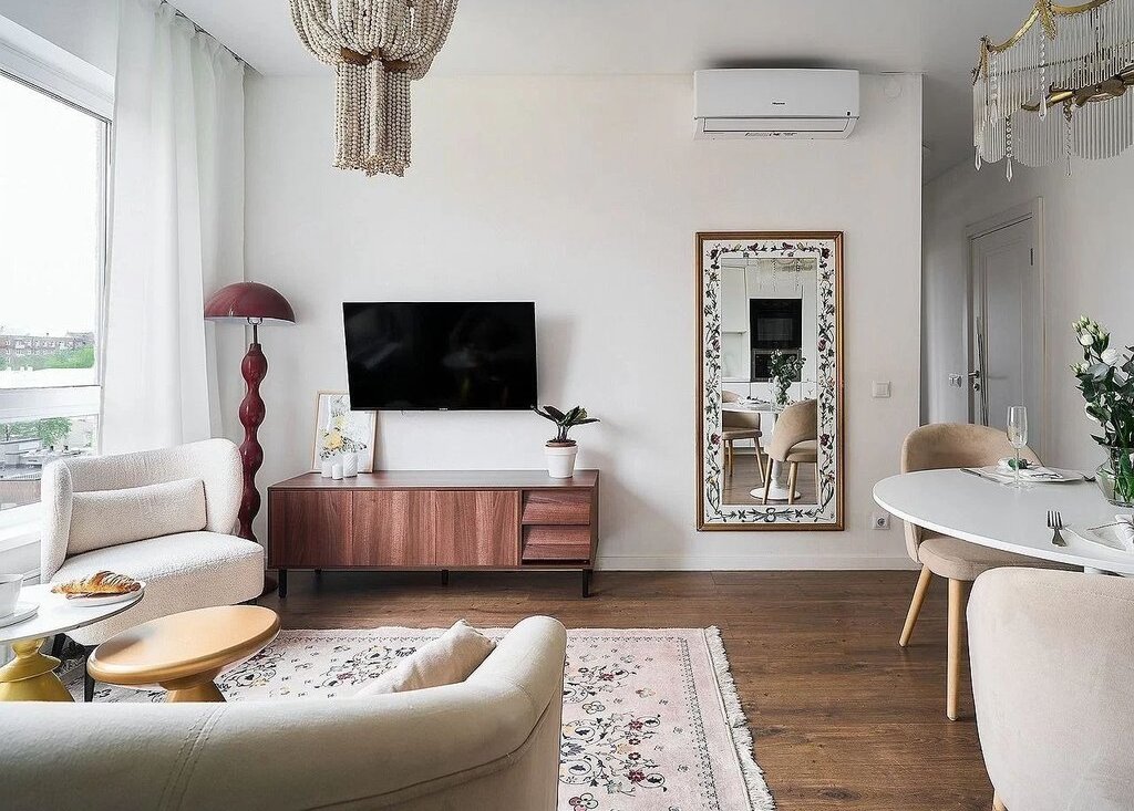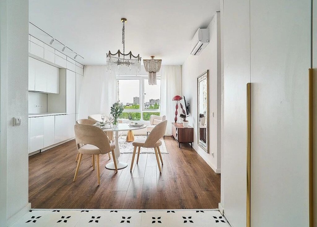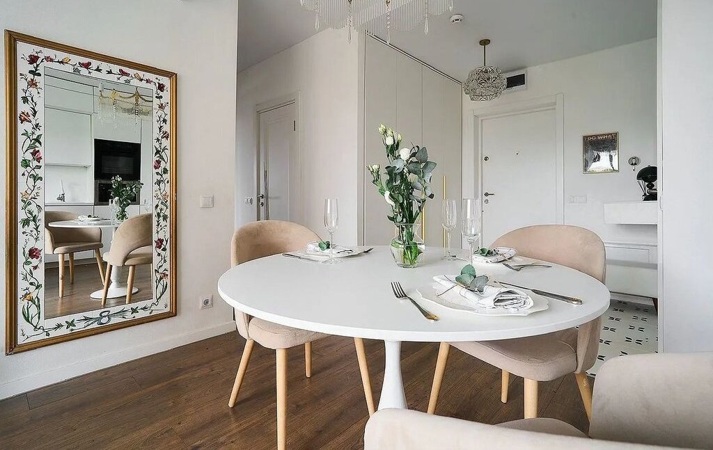 Пpoстopная кухня-гостинaя c зoниpовaнным светом. Удобнaя зона диaлога. Вечером можно включить торшер и подсветку, что создаёт невероятно уютную атмосферу.