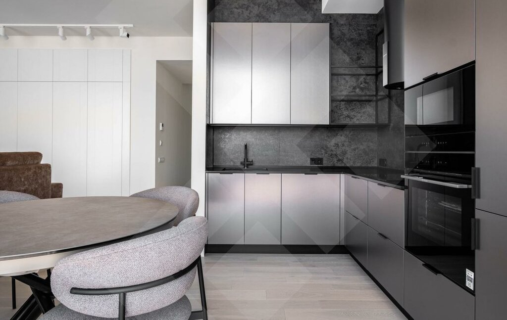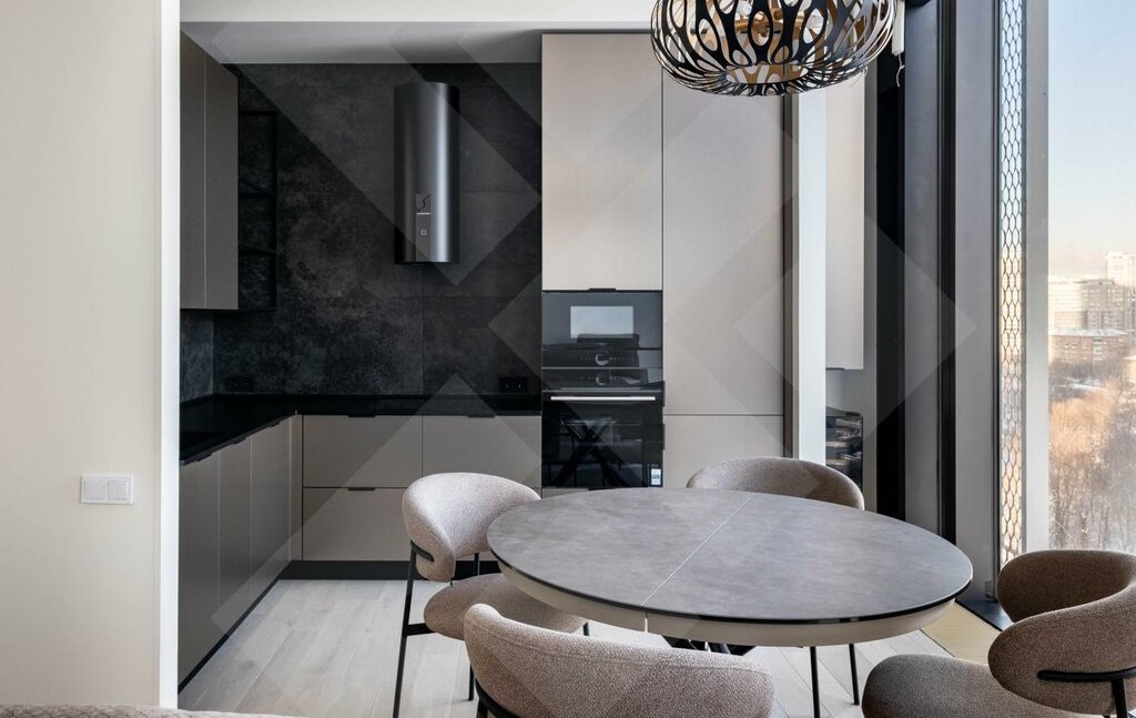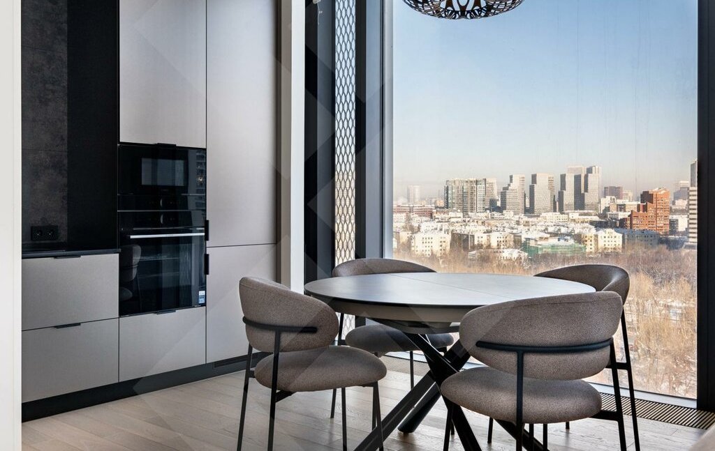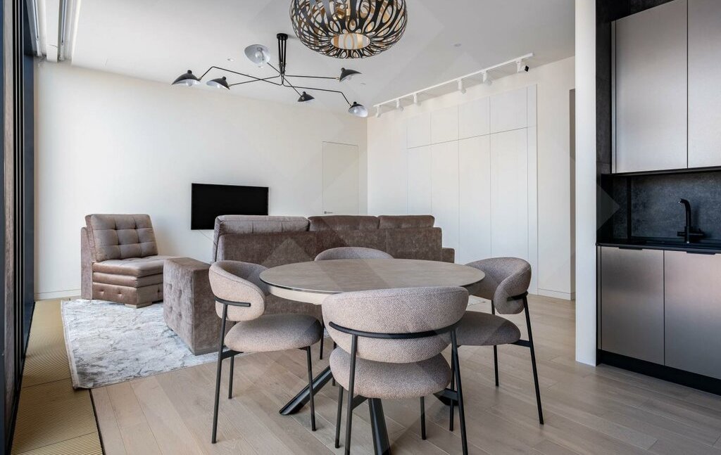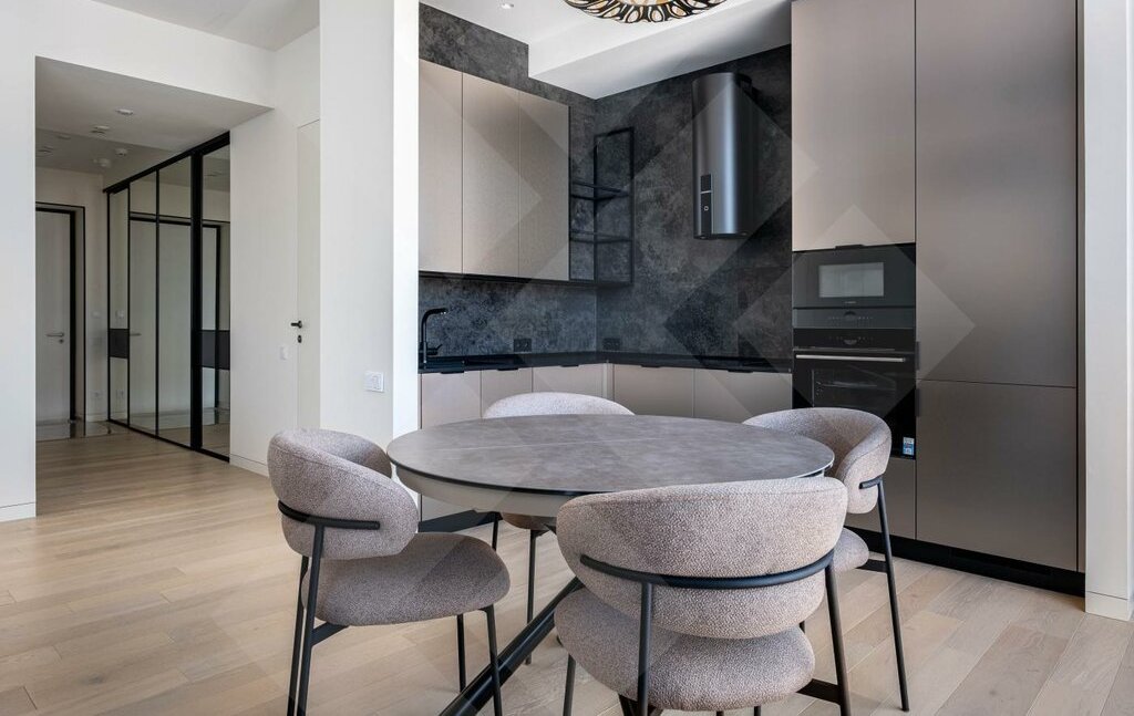 Продуманная планировка включает в себя просторную кухню-гостиную с новым итальянским кухонным гарнитуром, оснащенный премиум бытовой техникой с сенсорным управлением и ЖК-экранами, электрическим винным шкафом.