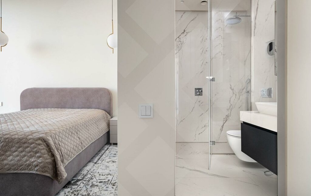 Спальня оснащена двумя полноразмерными шкафами, кроватью с премиальным ортопедическим матрасом, прикроватными тумбами из натурального дерева и бьюти-пространством с специализированным косметическим столиком.