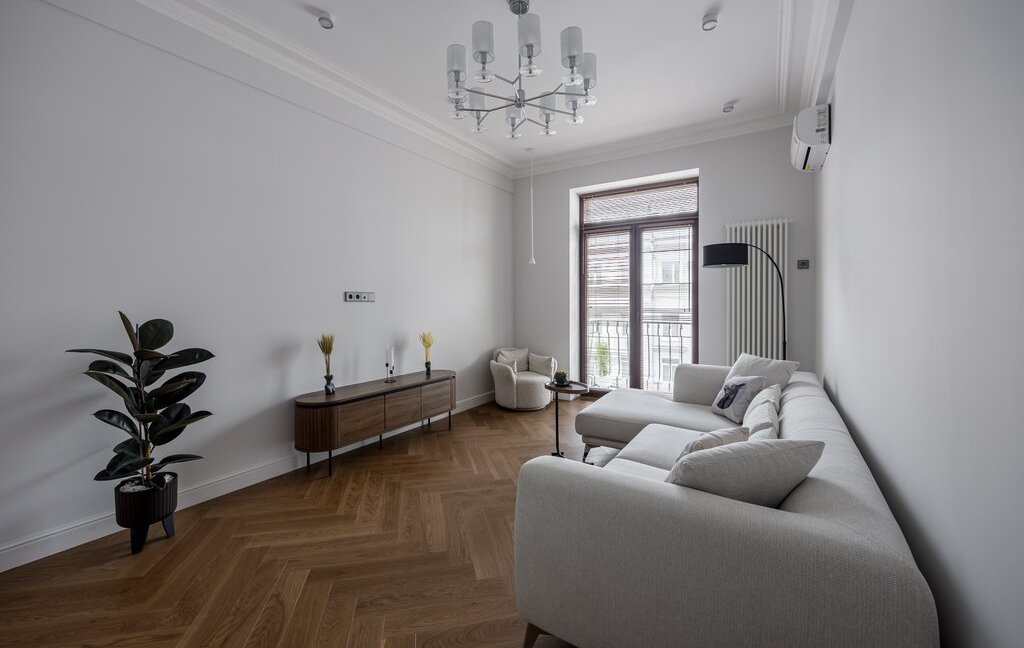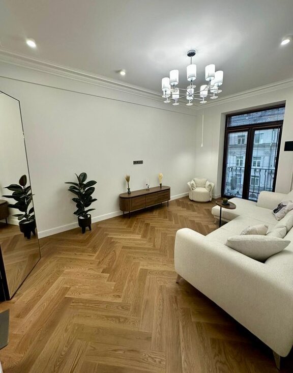 Высота потолков 3 м. На полу дубовый паркет, в гостиной восстановлена оригинальная лепнина.
