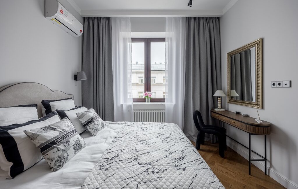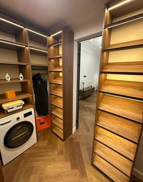 Стены выровнены и покрашены, двери срытого монтажа высотой 230 см. Вся встроенная мебель выполнена на заказ, мягкая мебель Dantone Home, подоконники из натурального мрамора. Шторы сшиты на заказ, на окнах бамбуковые жалюзи. Премиальная чистовая сантехника Bohemia и Villeroy Boch, ванна из мрамора, столешницы из кварцевого камня, освещение Maytoni, техника на кухне Bosch и De Dietrich, кондиционеры Royal Clima, видеодомофон.Теплые полы, бризер Tion для свежего воздуха, продуманное до мелочей пространство для жизни. Просторная гардеробная с подсветкой и зеркалом, можно разместить до 36 пар обуви. Сушильная и стиральная машины Bosch. Индивидуальная вентиляция, немецкие радиаторы Kohr Heim.