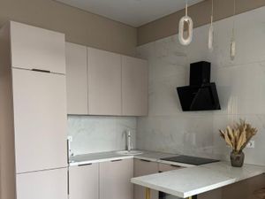 Техника: холодильник, индукционная плита с духовым шкафом, микроволновая печь, вытяжка, посудомоечная машина, телевизор, утюг, кондиционер