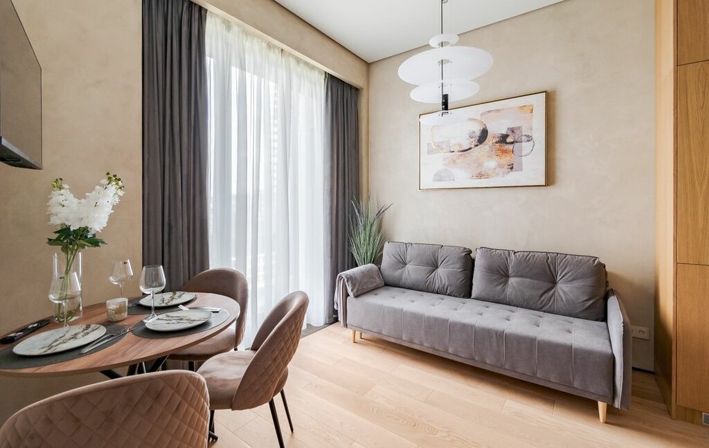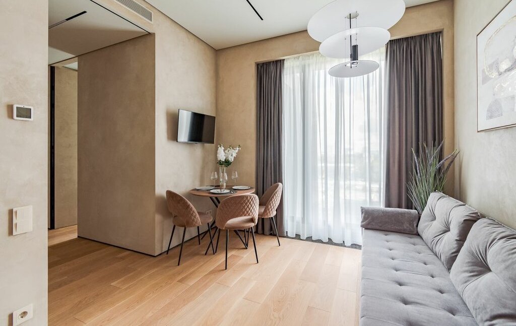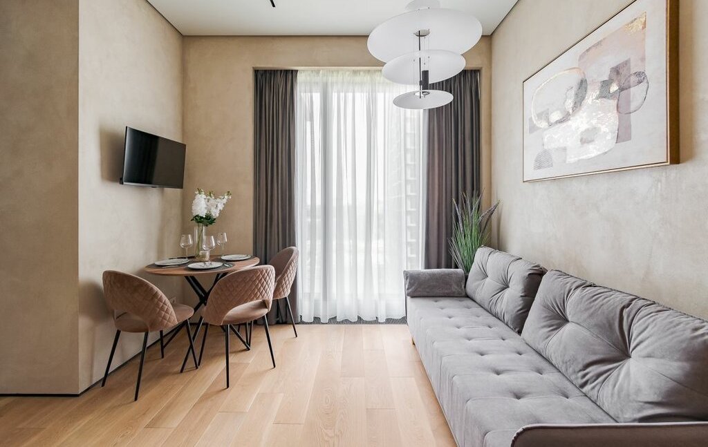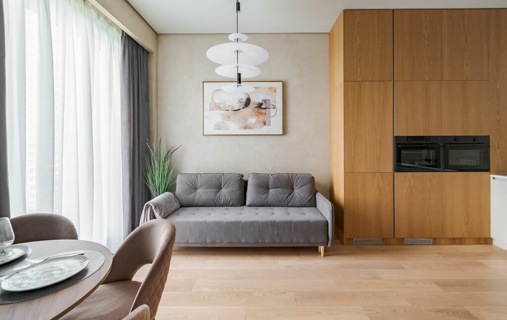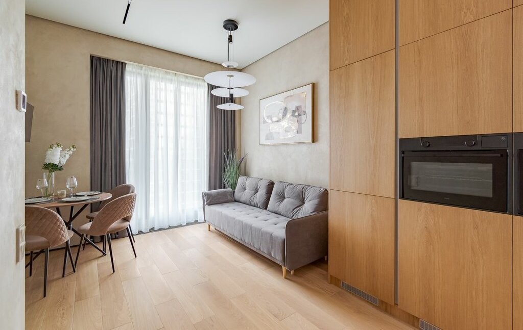 В квартире все продумано до мелочей, кухня-гостиная со всей техникой, мастер-спальня со своей гардеробной, вторая спальня с диваном, сан узел с душевой,в квартире есть все необходимое для комфортного проживания.