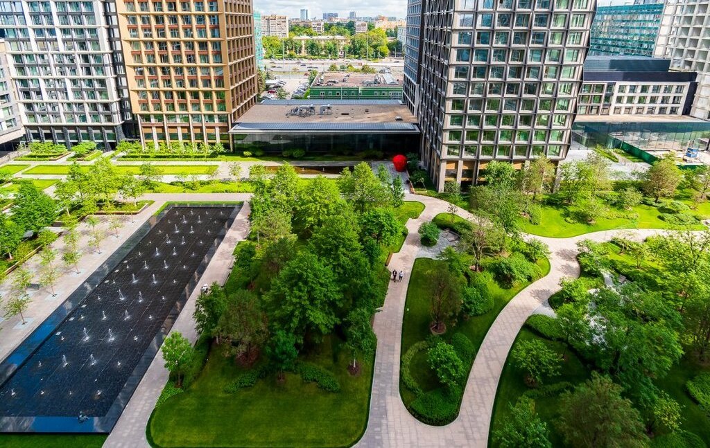 Комплекс включает в себя закрытый частный парк для жильцов площадью 3 Га, фонтаны, детские площадки и открытые общественные пространства.