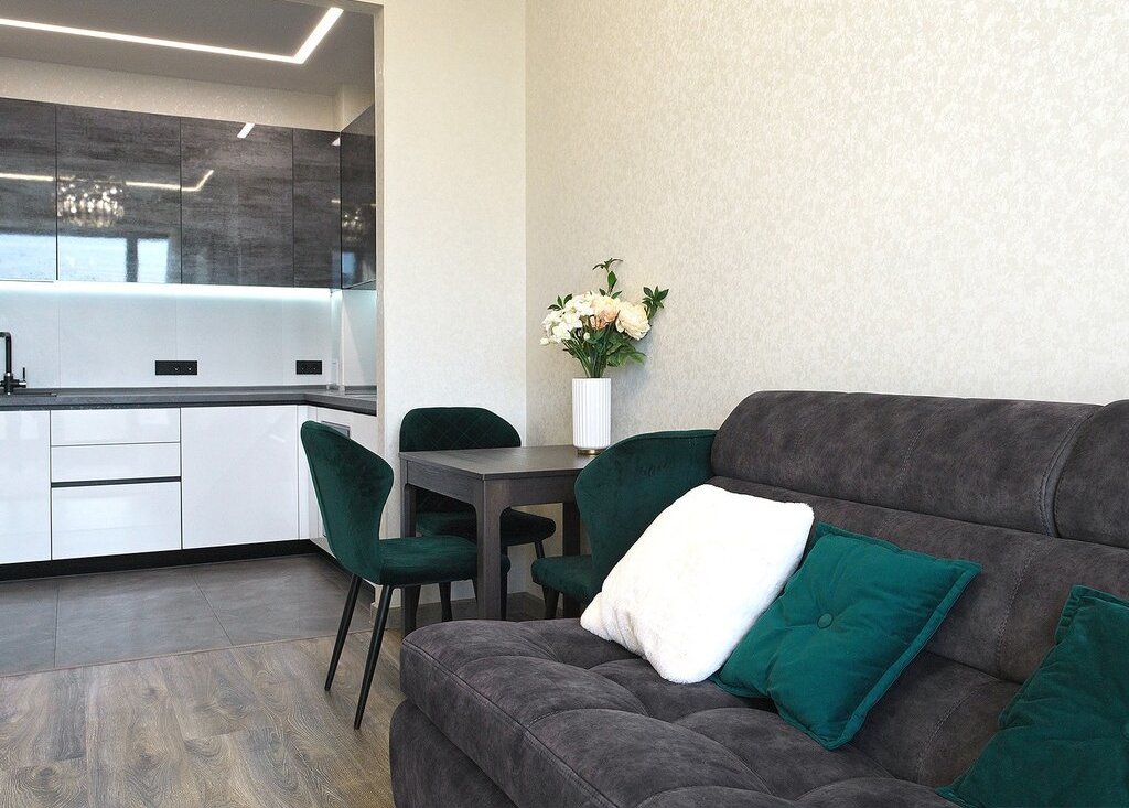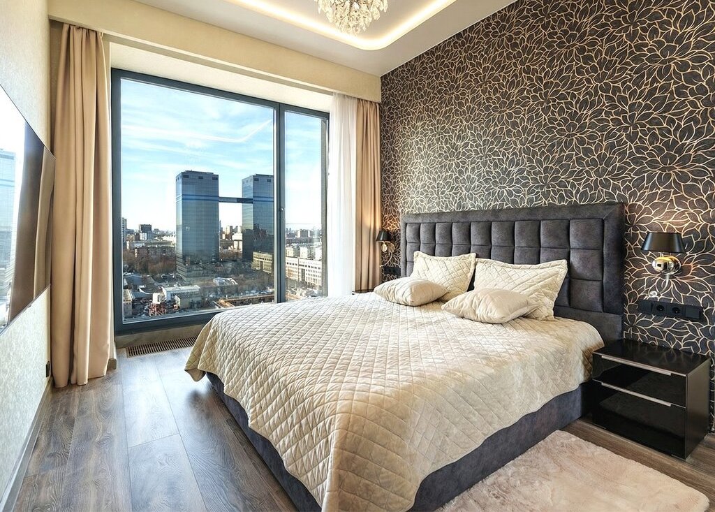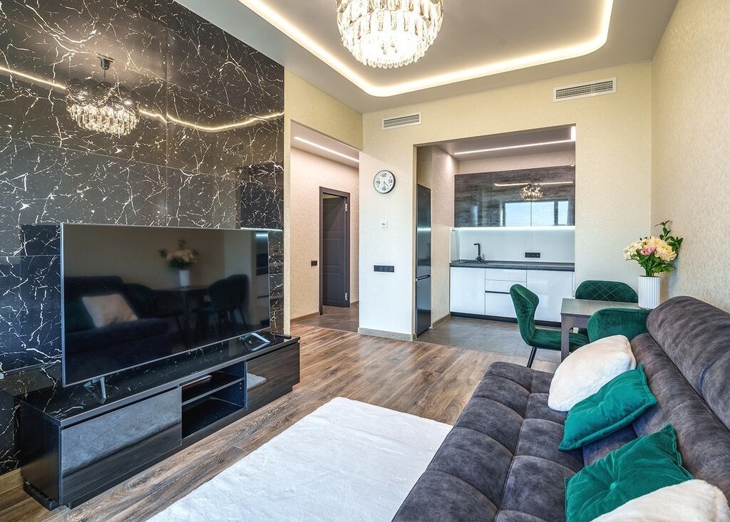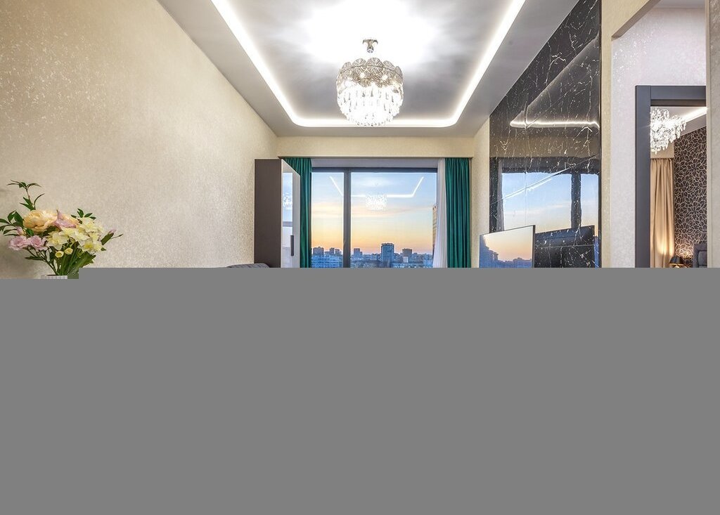 Планировка: кухня-гостиная, изолированная спальня, прихожая, ванная комната/санузел. В гостиной расположен уютный и очень стильный диван, который раскладывается в полноценное двуспальное место, телевизор 65', шкаф и стол для полноценной работы. В спальне шикарная двуспальная кровать с ортопедическим матрасом, стильные прикроватные тумбы, большой шкаф-купе с зеркалами и телевизор 55'. В прихожей оборудован вместительный шкаф-купе с продуманной системой хранения вещей. Кухня оборудована по последнему слову техники: стильный кухонный гарнитур, плита Elecrtolux с мощной вытяжкой, холодильник Samsung, духовой шкаф Electrolux, СВЧ-печь Panasonic и посудомоечная машина Electrolux. Рядом расположена обеденная зона с раскладывающимся столом. Санузел оборудован качественной сантехникой: огромной, шикар