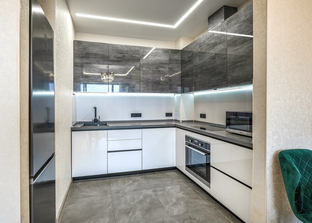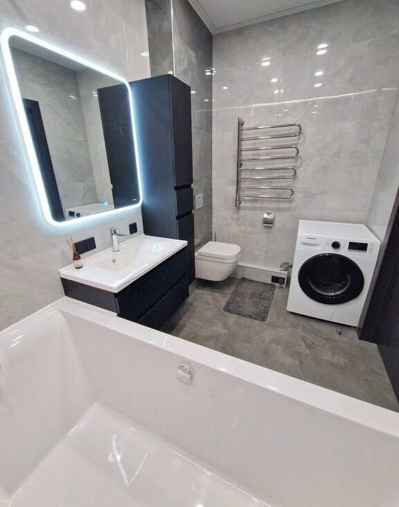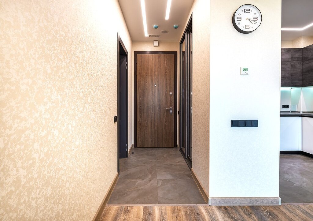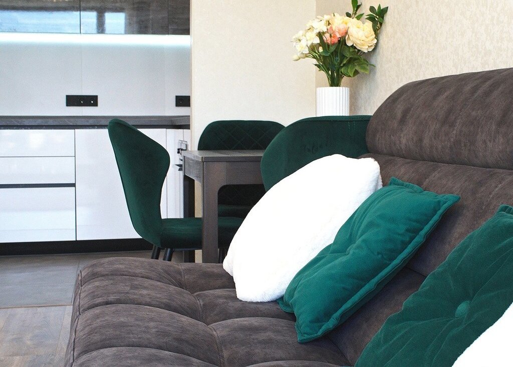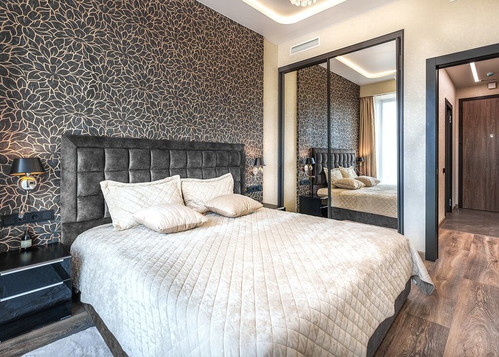 Планировка: кухня-гостиная, изолированная спальня, прихожая, ванная комната/санузел. В гостиной расположен уютный и очень стильный диван, который раскладывается в полноценное двуспальное место, телевизор 65', шкаф и стол для полноценной работы. В спальне шикарная двуспальная кровать с ортопедическим матрасом, стильные прикроватные тумбы, большой шкаф-купе с зеркалами и телевизор 55'. В прихожей оборудован вместительный шкаф-купе с продуманной системой хранения вещей. Кухня оборудована по последнему слову техники: стильный кухонный гарнитур, плита Elecrtolux с мощной вытяжкой, холодильник Samsung, духовой шкаф Electrolux, СВЧ-печь Panasonic и посудомоечная машина Electrolux. Рядом расположена обеденная зона с раскладывающимся столом. Санузел оборудован качественной сантехникой: огромной, шикар