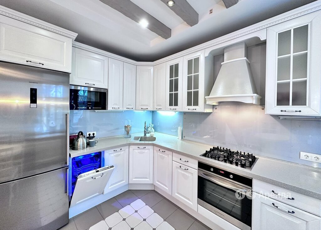 Техника: холодильник, газовая плита, духовка, вытяжка, СВЧ печь, чайник, тостер, посудомоечная и стиральная машины, пылесос, парогенератор, телевизор