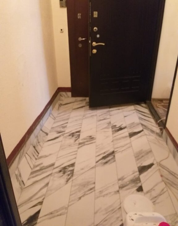 Тамбур с металлической дверью и полами из керамогранита на 2 квартиры закрывается.