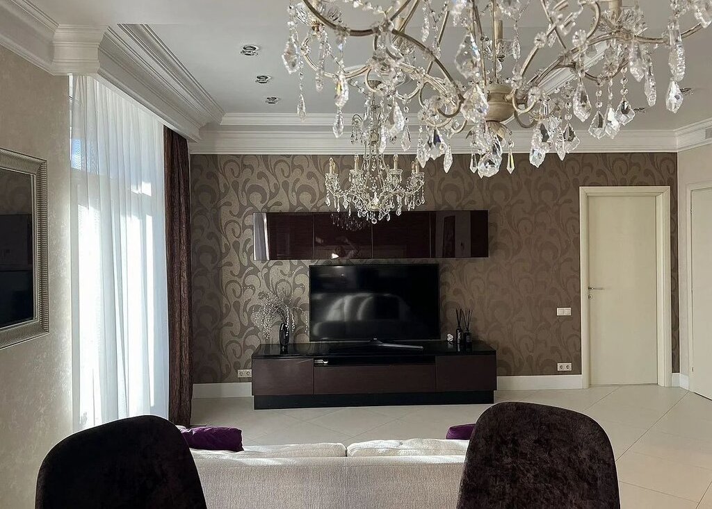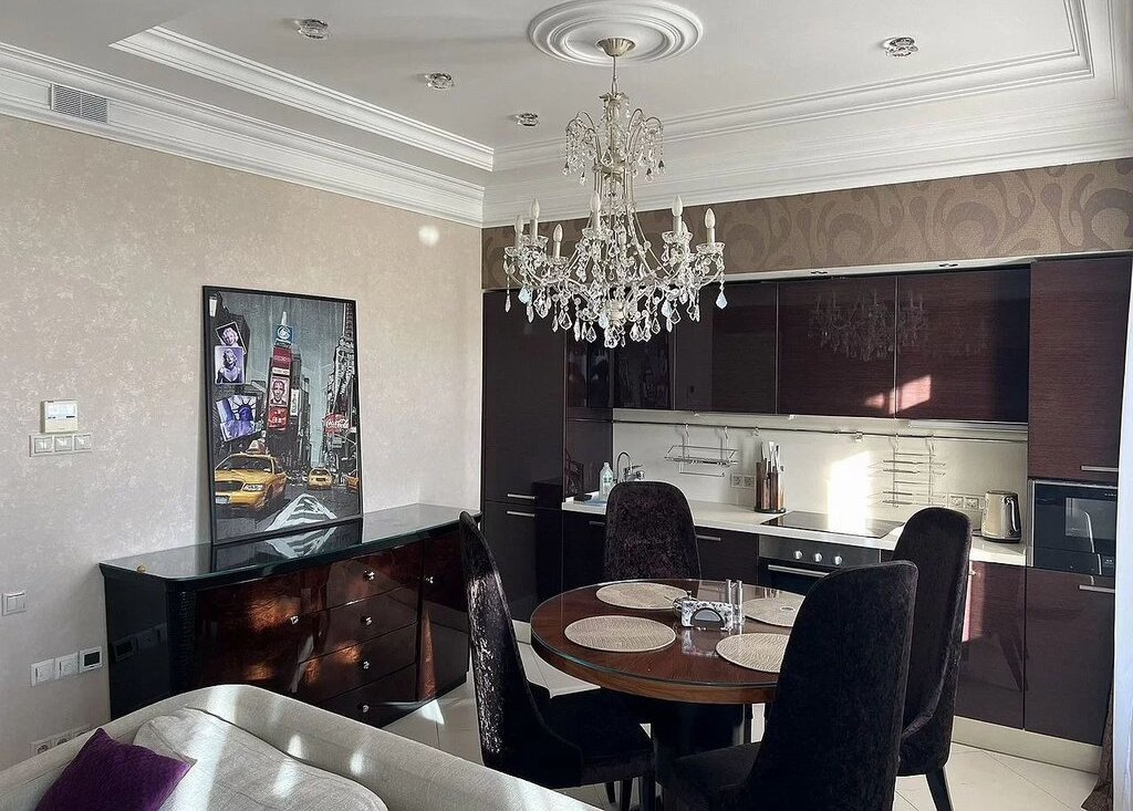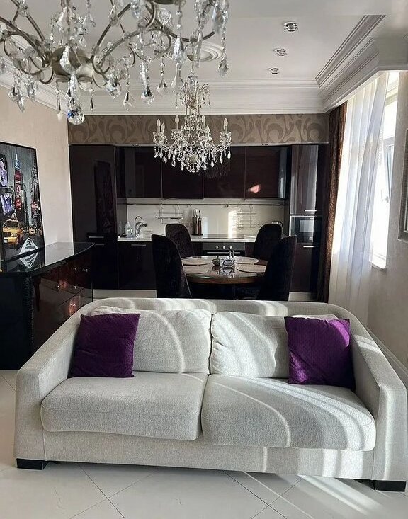 Встроенная кухня с техникой - посудомоечная машина, варочная панель и духовой шкаф, встроенный холодильник с морозильным отсеком, фильтр для воды с системой обратного осмоса, измельчитель пищевых отходов, микроволновая печь. Круглый обеденный стол со стульями, мягкий диван и большой телевизор.