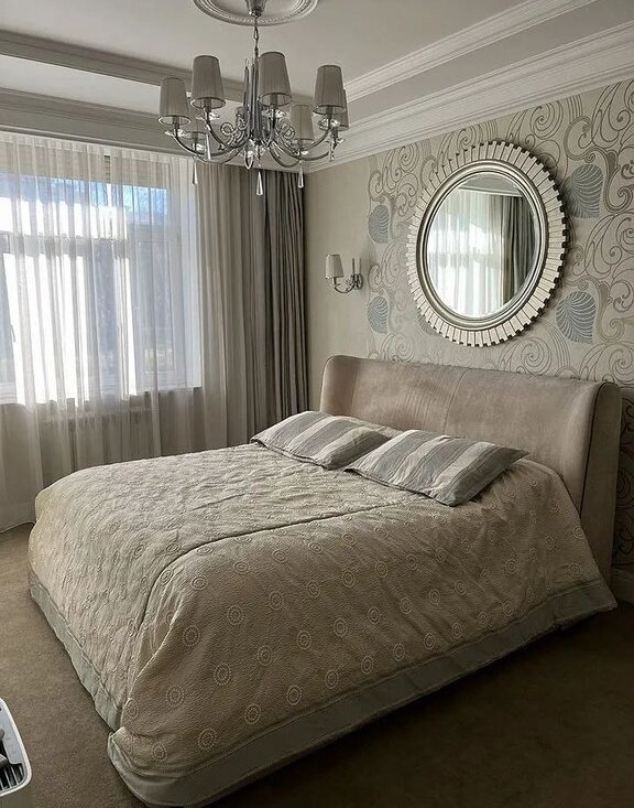 В Спальне- огромная кровать Кing- Sizе с ортопедическим матрасом и мягким основанием, гардеробная комната.