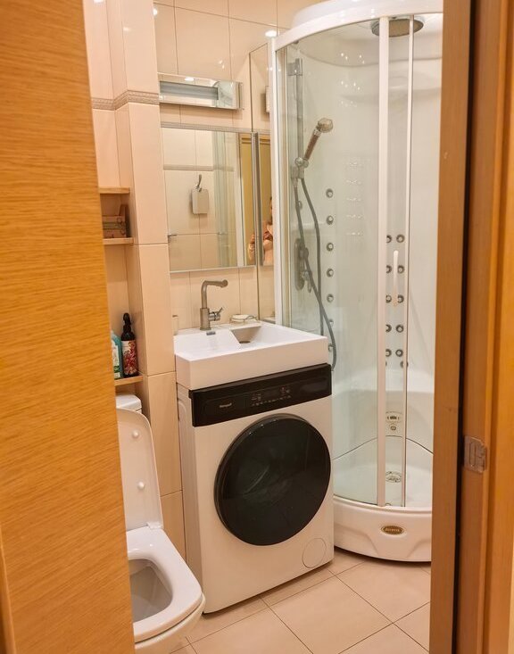 Кухня-гостиная оборудована удобным диваном, тумбой под телевизор, холодильником, посудомоечной машиной, варочной панелью, вытяжкой, микроволновой печью, фильтром. В ванной комнате установлена раковина, зеркало, стирально-сушильная машина, душевая кабина. В спальне имеется удобная кровать с матрасом, две прикроватные тумбочки, а также большой комод для одежды. В прихожей установлен вместительный встроенный шкаф. В квартире установлен кондиционер.