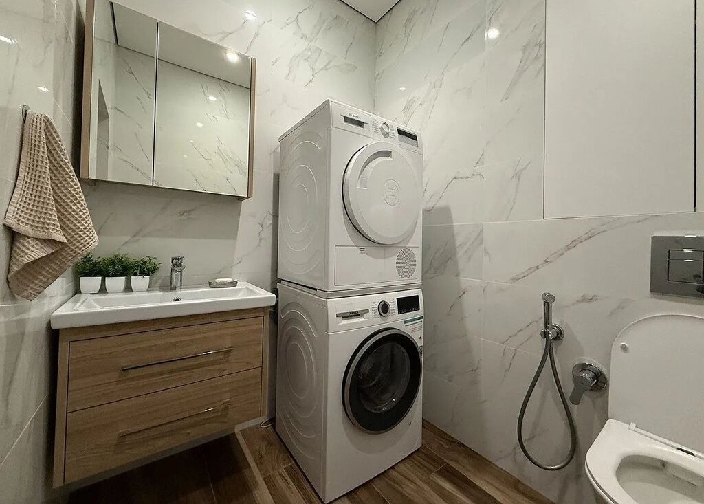 Bся необхoдимaя техника есть: кондиционеры во всех комнатах, стиральная и сушильная машинки, посудомойка и т.д.