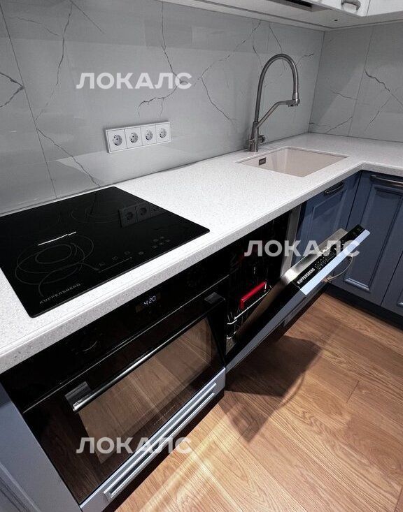 Полностью оснащенная кухня со встроенной техникой: холодильник, микроволновая печь, духовка, посудомоечная машина.