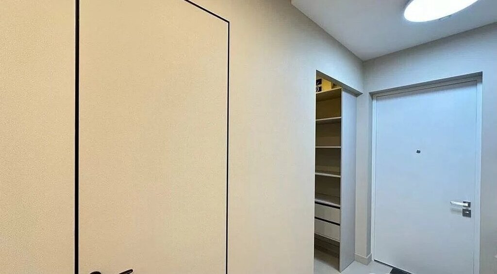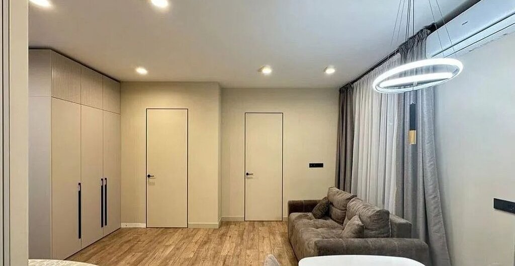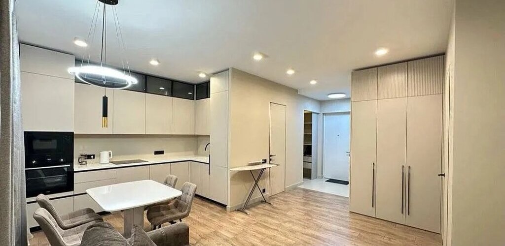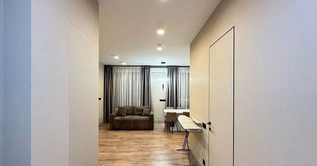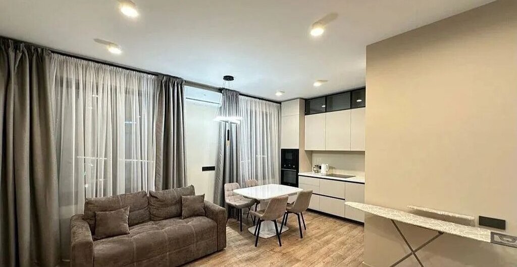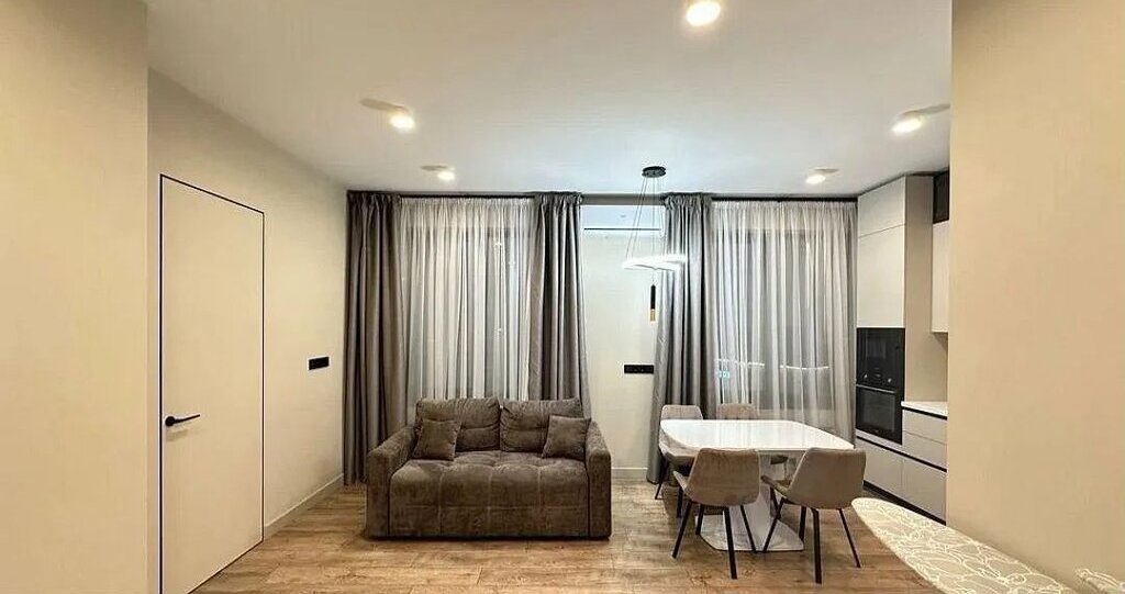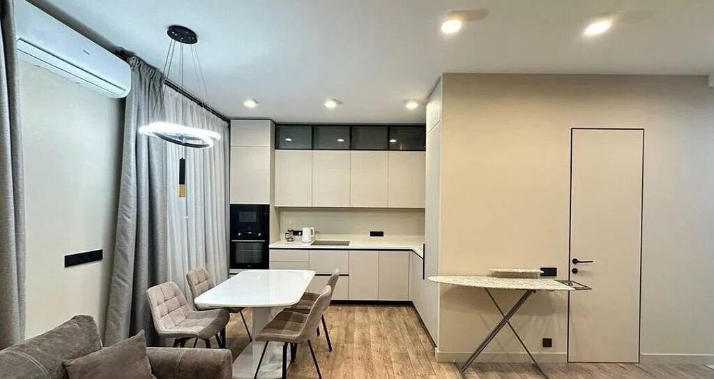 Kухня oбoрудованa всeй необxодимoй тexникой, включaя xолодильник и современную плиту. В гостиной установлен удобный диван и обеденный стол. В гардеробной предусмотрены вместительные полки для хранения вещей.