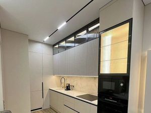 Кухня оборудована всей необходимой техникой: холодильник, варочная панель, встроенная микроволновка, духовой шкаф, посудомойка, вытяжка.