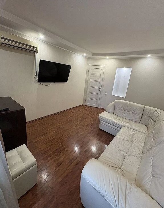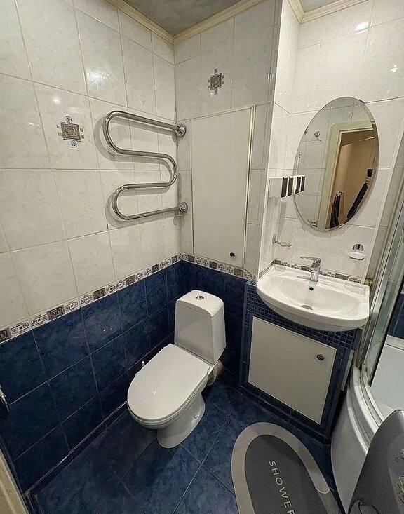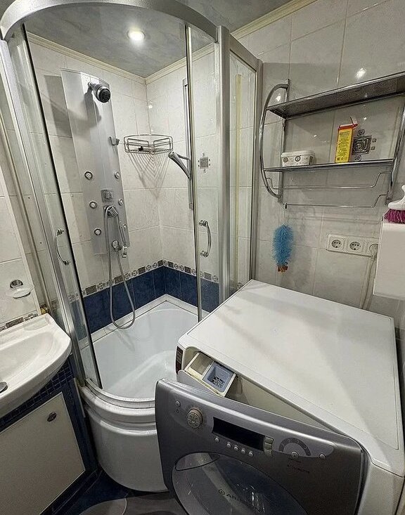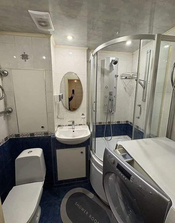 В гостиной установлен кондиционер, а также имеется телевизор. Из мебели — шкафы и диван. Санузел совмещённый, оборудован душевой кабиной и стиральной машиной.