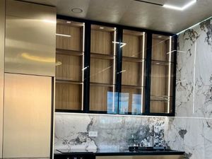 Вся мебель в квартире сделана на заказ. Кухня оснащена встроенной современной бытовой техникой марки Bosch. В кухне есть встроенная посудомоечная машина, встроенный холодильник, измельчитель пищевых отходов, встроенная стиральная машина. Установлена столешница из искусственного камня.