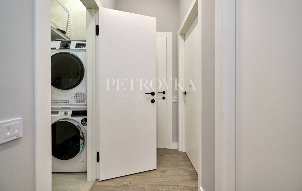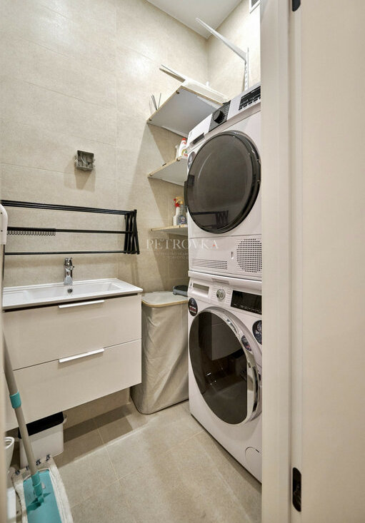Постирочная зона с полноразмерной стиральной машиной, сушилкой и компактной мини‑сушилкой — всё спрятано, никакого визуального шума.
