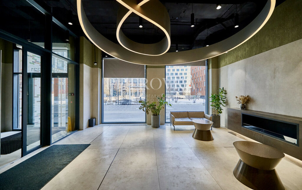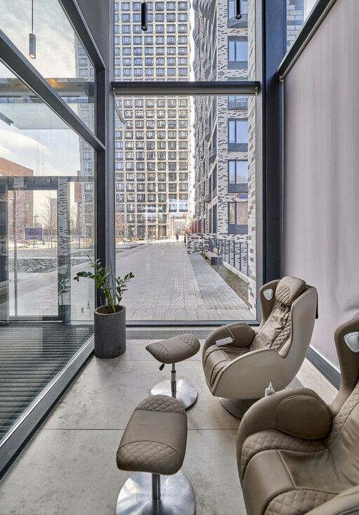 Комфортное лобби: монохромный дизайн, просторные входные группы с элементами из натурального камня, зона отдыха с мягкими диванами и панорамными окнами.