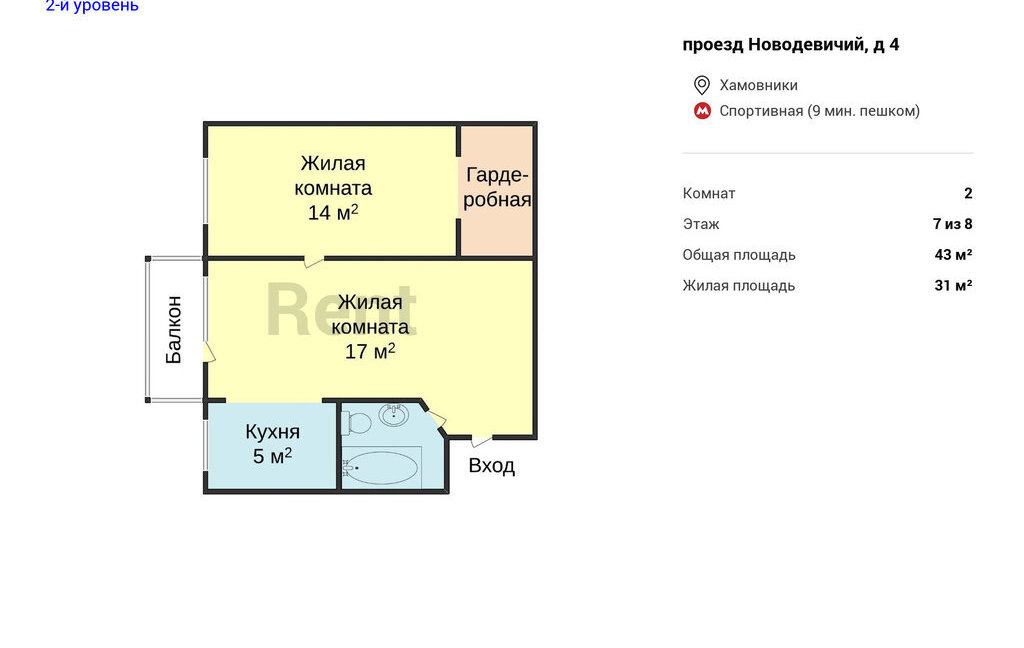 2-комнатная квартира: Москва, Новодевичий проезд, 4 (43 м²)