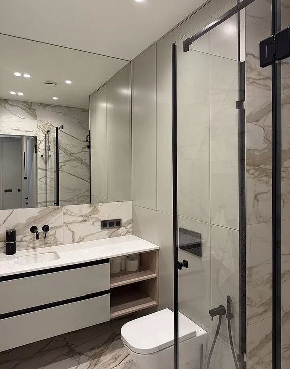 Совмещенный санузел выполнен в современном стиле с качественной сантехникой. В доме предусмотрены два пассажирских и два грузовых лифта, консьерж обеспечивает безопасность и удобство. Парковка подземная и многоуровневая наземная. Во дворе оборудована спортивная площадка.