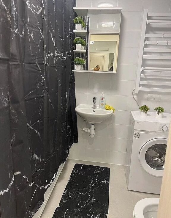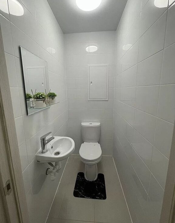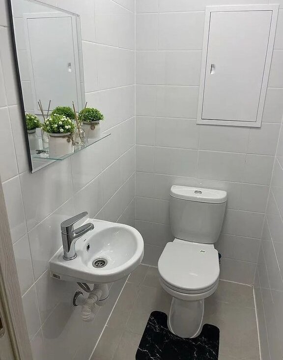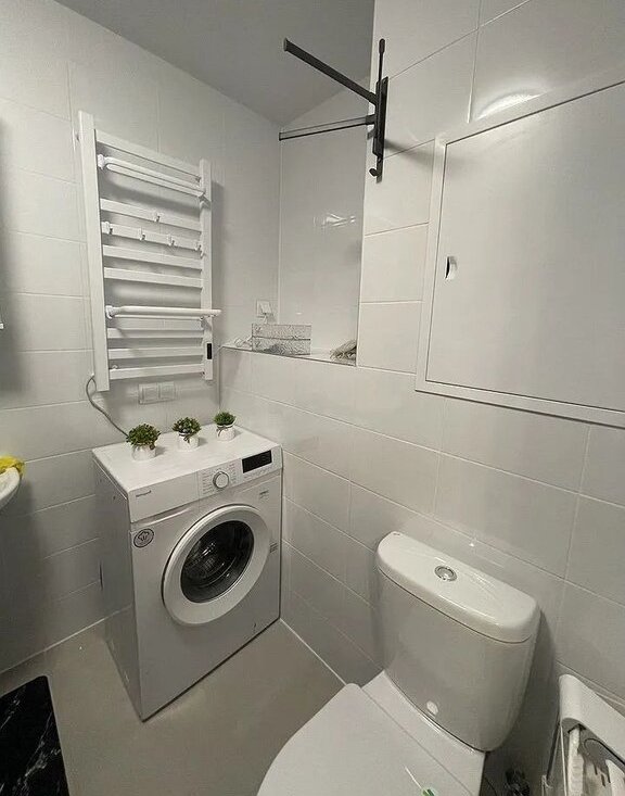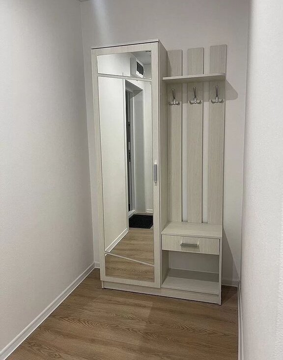 В спальне удобная двуспальная кровать и вместительный шкаф. В прихожей предусмотрены удобные полки и зеркало. Санузел раздельный, оформлен в современном стиле.