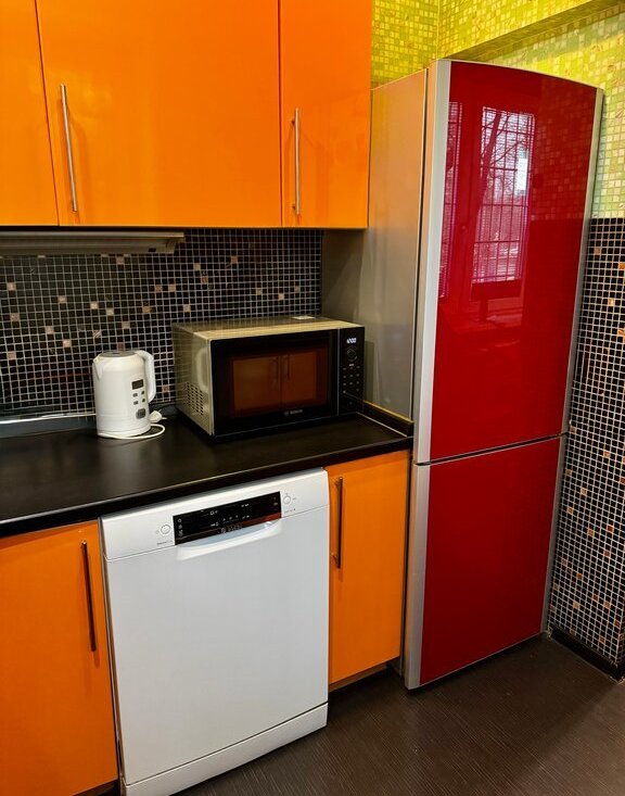 газовая плита, духовка, холодильник, посудомоечная машина, полный набор посуды.