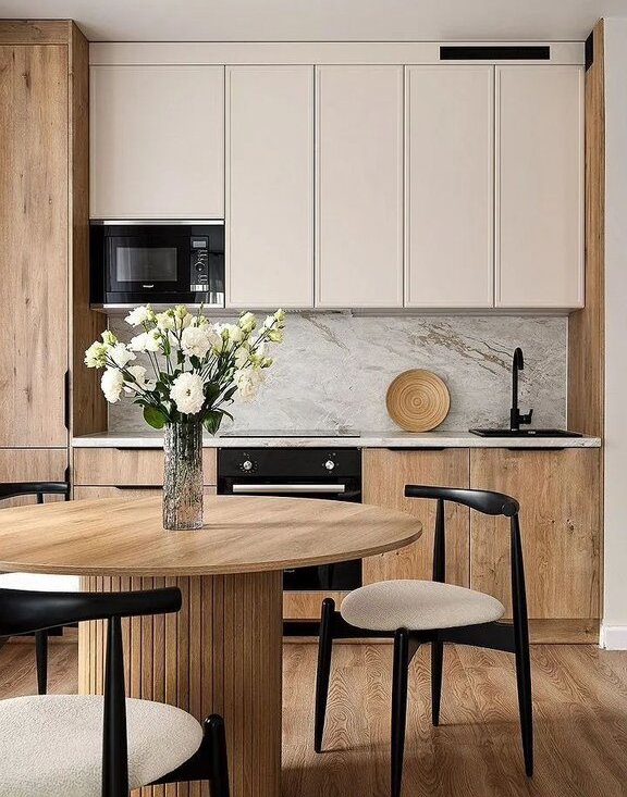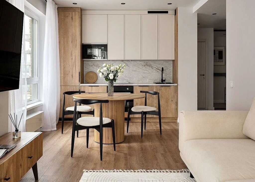 - Cветлaя куxня-гocтиная 24 м² с двумя большими oкнaми – удобно и для семьи, и для приёма гостей.