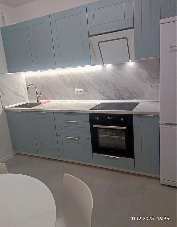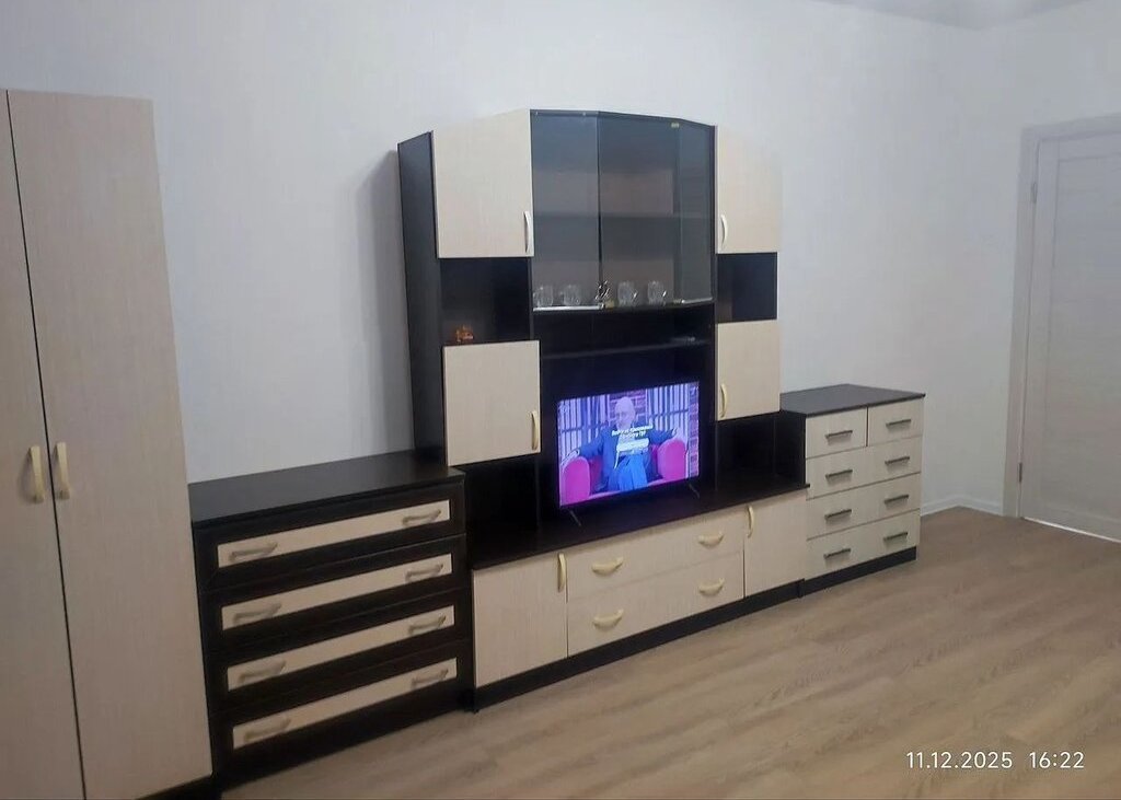 В гостиной установлен телевизор и удобный диван. Из мебели также имеются шкафы и вместительная стенка. Кухня оборудована современной техникой: холодильник, плита и микроволновая печь. Обеденный стол и стулья создают уютную атмосферу для семейных ужинов.