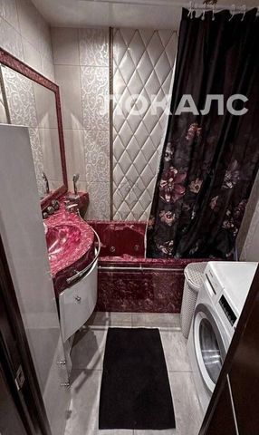 В ванной комнате установлены : раковина и ванная с большим зеркалом из искусственного камня с душевой системой и гидро -аэромассажем , шкаф под раковиной и рядом тумба с пятью секциями хранения вещей, стиральная машина Воsсh, полотенцесушитель.
