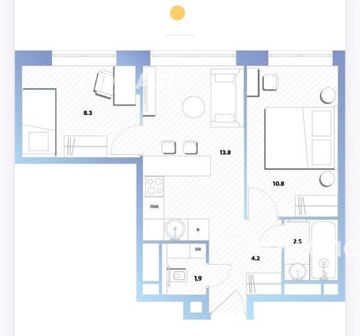 - Квартира 40 кв. м, две комнаты (спальни 12 и 8 кв.м), гостиная + кухня (14 кв.м), санузел раздельный.