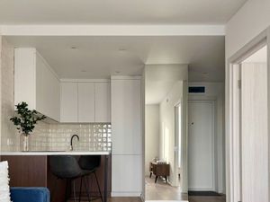 - В квартире есть вся необходимая бытовая техника (посудомойка, стиралка, духовка, варочная панель) и полноценная свежая кухня, минимум мебели, кондиционер.