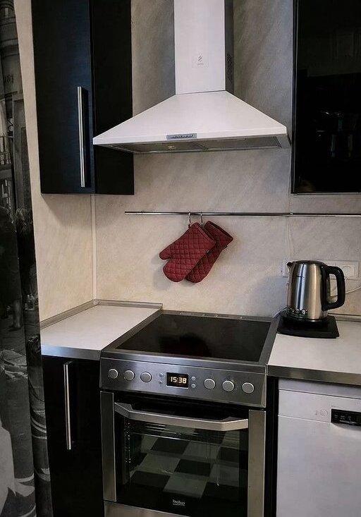 Кухня-столовая полностью оборудована: электрическая плита, духовой шкаф, вытяжка, микроволновая печь, посудомоечная машина, холодильник, электрочайник, измельчитель (диспоузер). Удобная рабочая поверхность и достаточное количество мест для хранения.