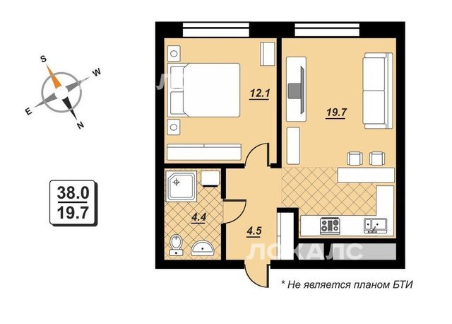 Квартира евро-формата с наиболее удобной планировкой – кухня-гостиная 19,7 кв.м. и спальня 12 кв.м. Потолки 3 метра. Планировку смотрите на фотографии.