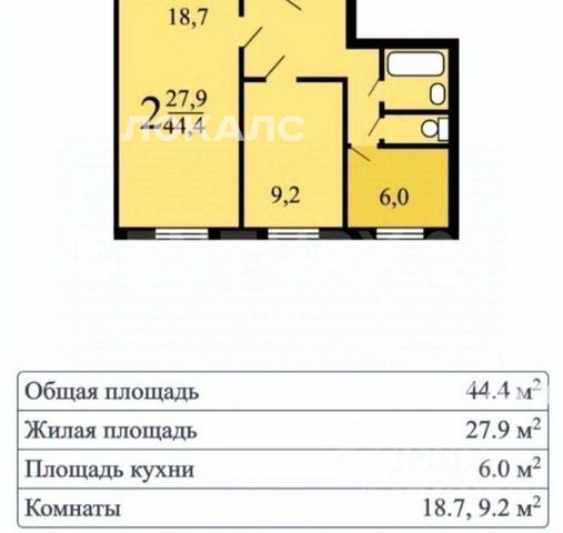 Общая площадь: 44,2 кв. м Жилая площадь: 27,9 кв. м Кухня: 6 кв. м