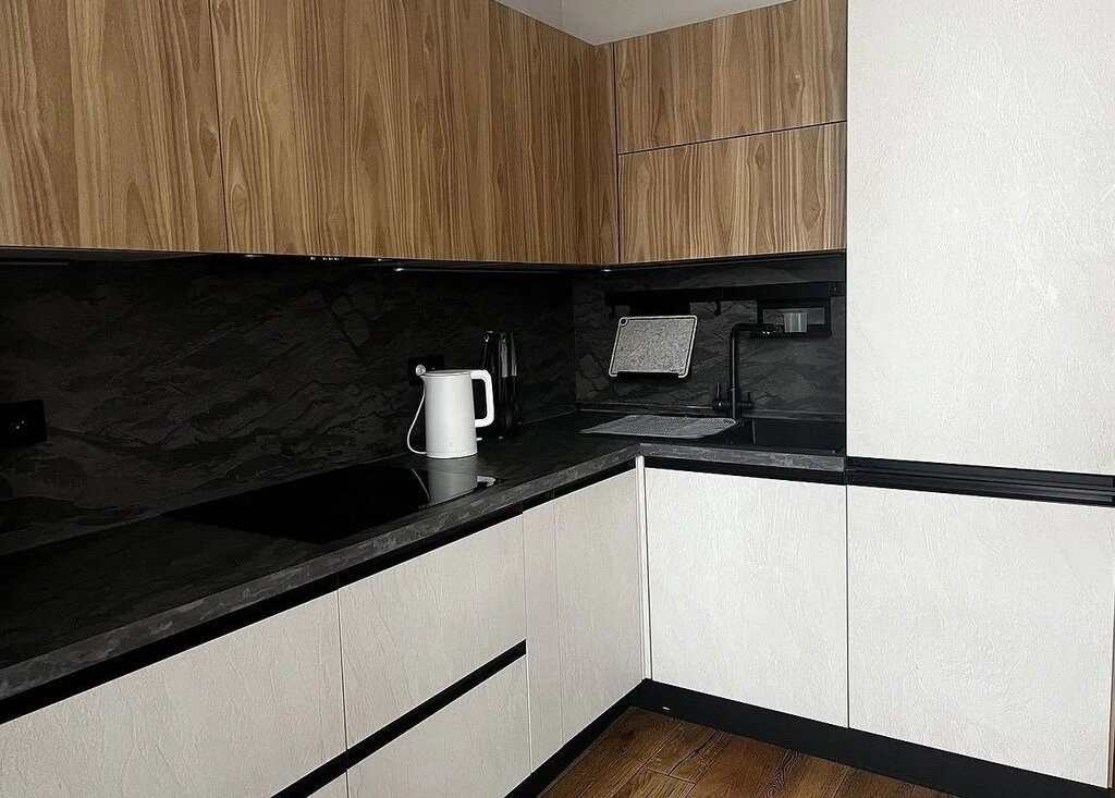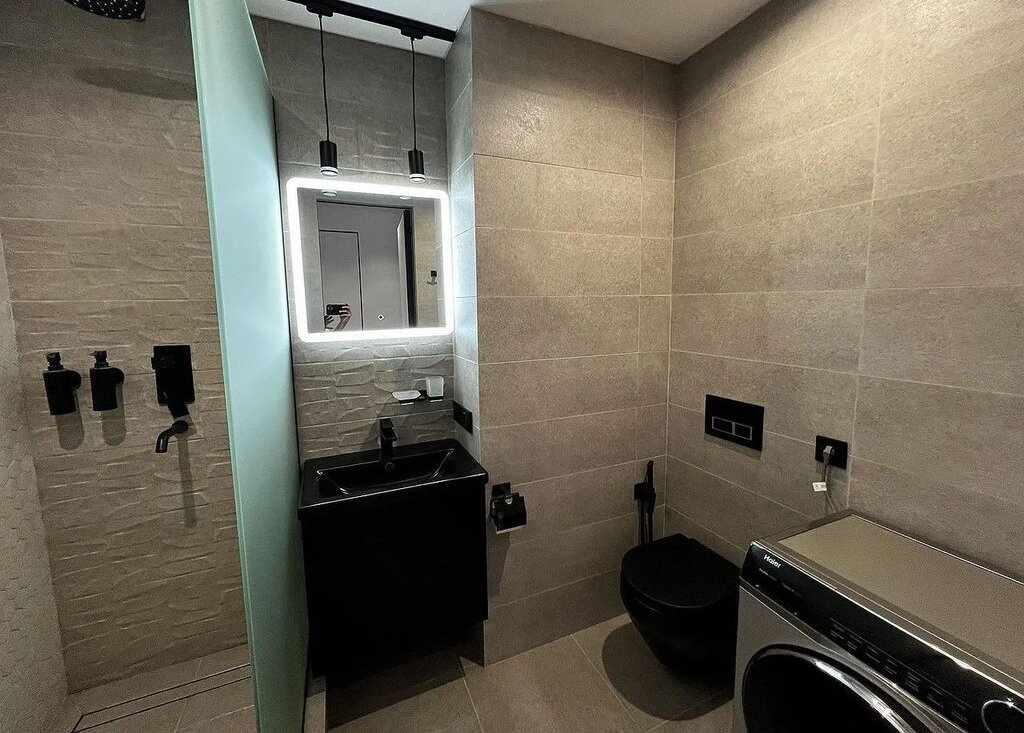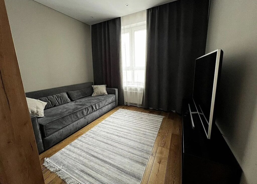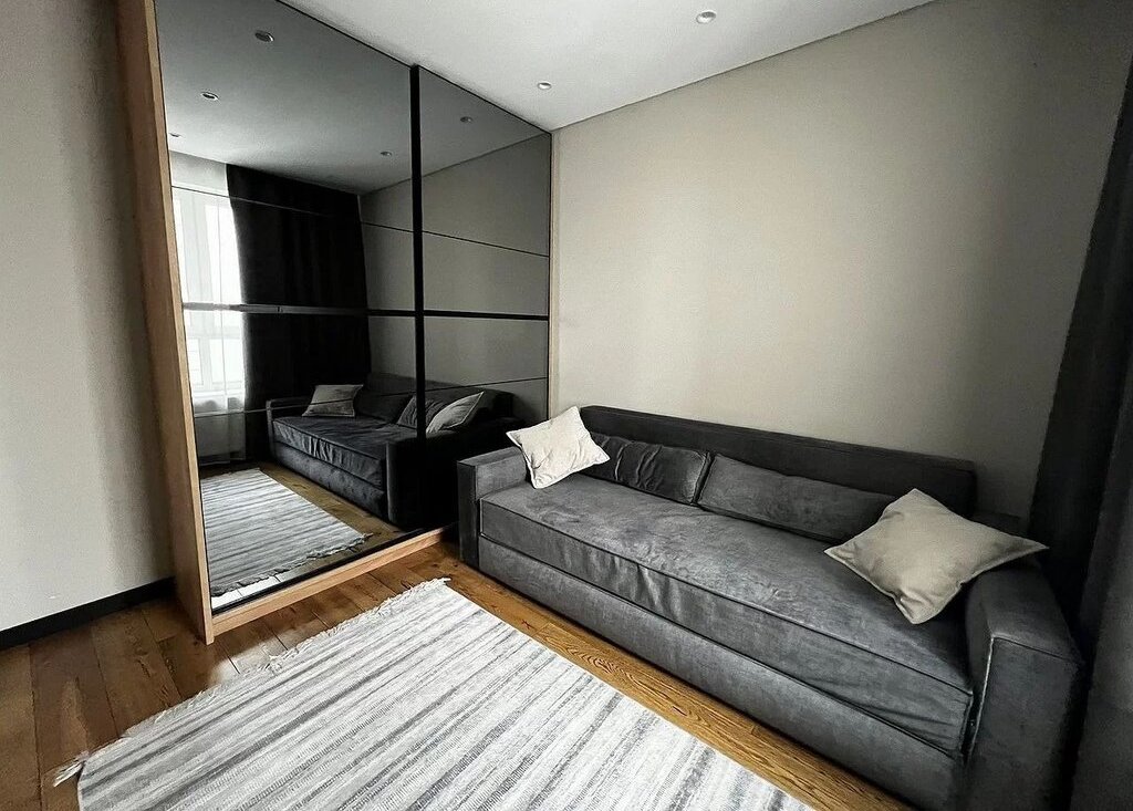 Кухня площадью 11 м² оборудована современной техникой: холодильник, плита, духовой шкаф с функцией микроволновой печи, посудомоечная машина и фильтр для воды. В гостиной установлен телевизор и удобный диван, а также вместительный шкаф для хранения вещей. В спальне — большая кровать и рабочее место.