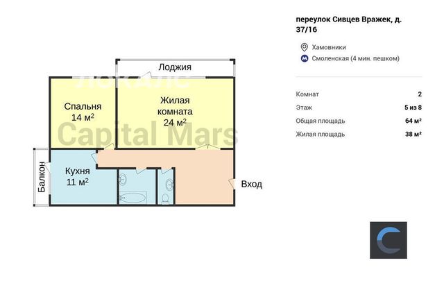 2-комнатная квартира: Москва, переулок Сивцев Вражек, 37/16 (64 м²)