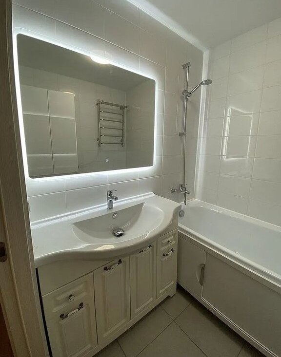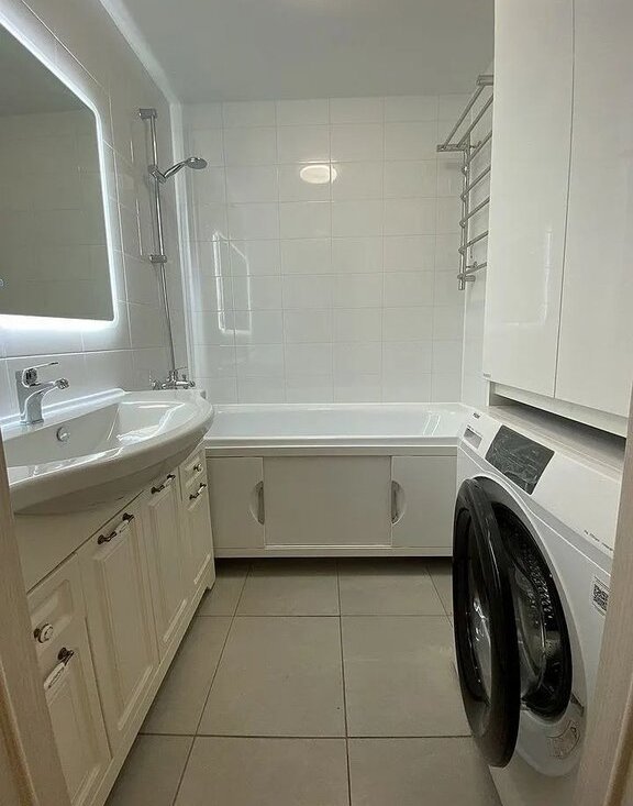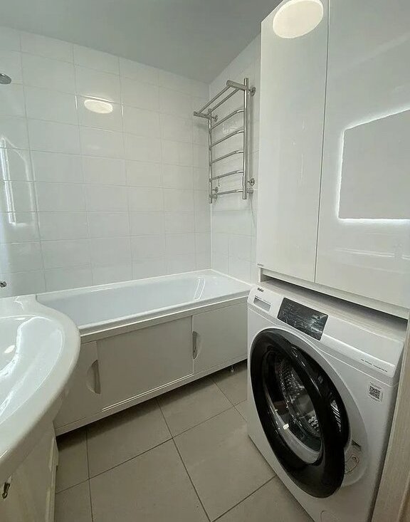 4. Ванная: стиральная машина, встроенная в пенал, тумба с раковиной, зеркало.