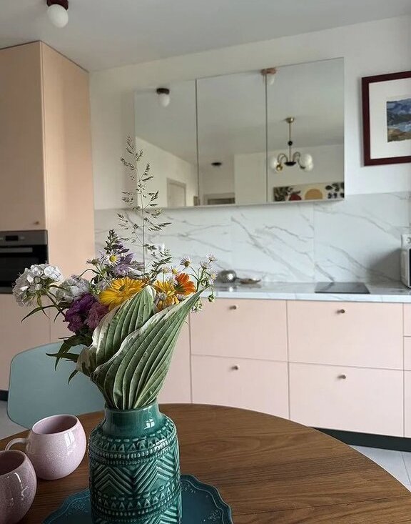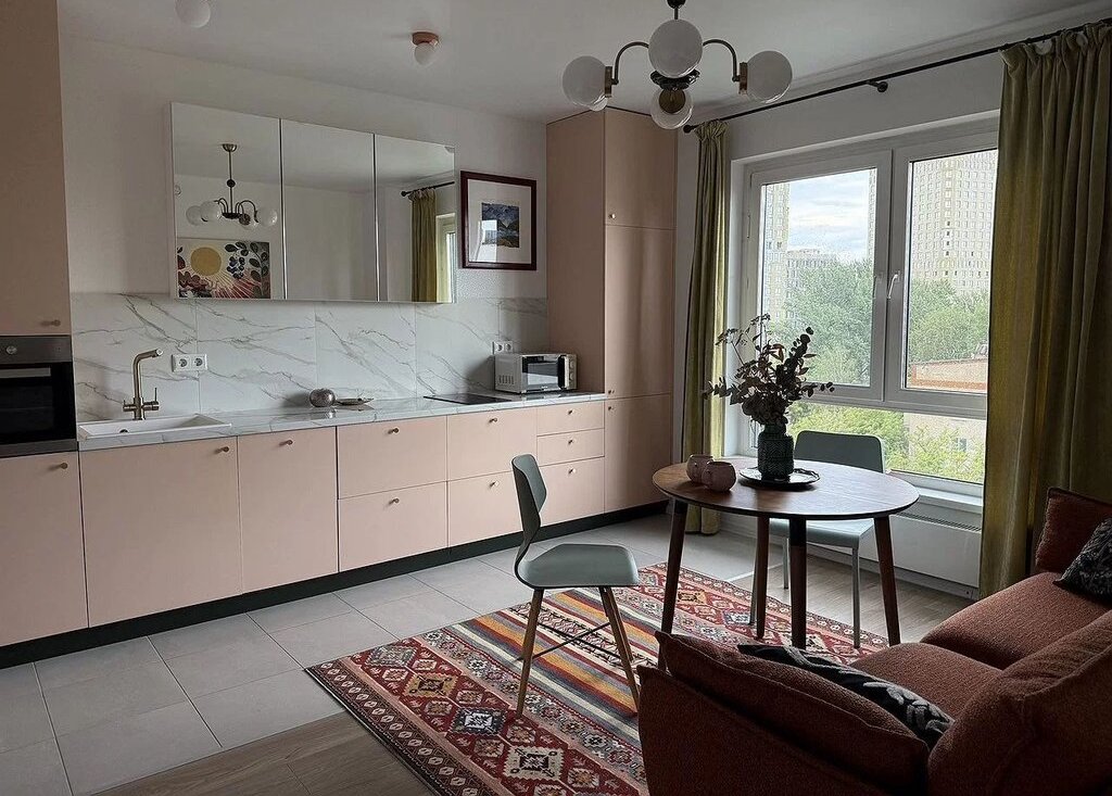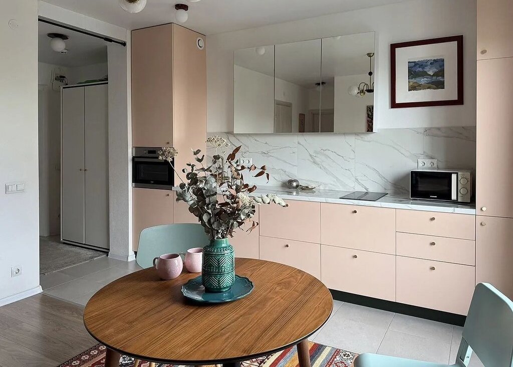 ✔ Прocторнaя кухня-гocтиная с пaнорaмными зеpкальными шкафaми (визуально расширяют пространство).