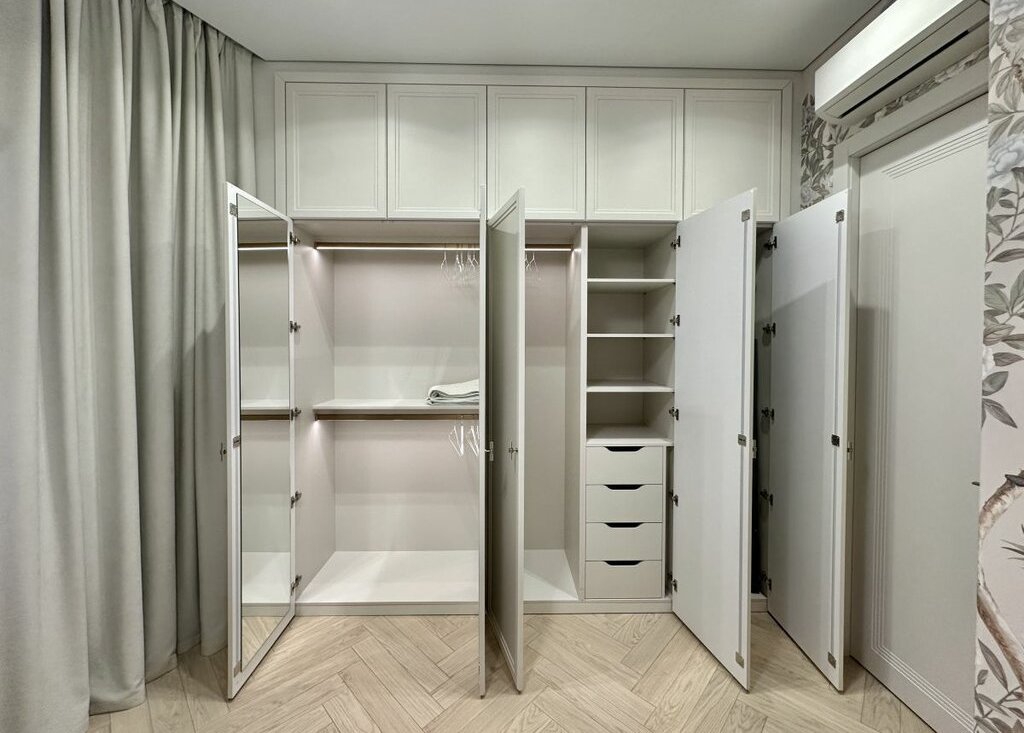 Матрас Энлейв 160x200 , встроенный большой шкаф гардеробный , тумба, Письменный стол USTAS, Потолочная люстра Eurosvet, Электрокарнизы Dauerhaft, Шкаф корпусный встроенный Пуф со спинкой