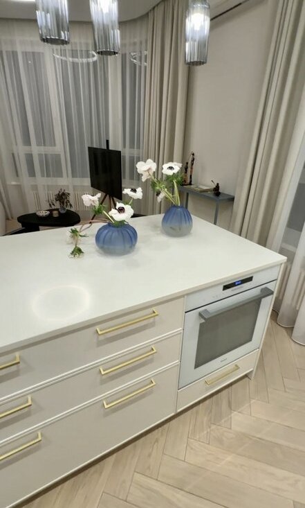 КУХНЯ- ГОСТИНАЯ: Кухонный гарнитур с островом , встроенный кухонный гарнитур, столешница кухни из искусственного камня Grandex , Диван, встроенная техника: варочная панель , духовой шкаф с функцией СВЧ, Измельчитель Bone Crusher , холодильник двухкамерный (Weissgauff), посудомоечная машина (Weissgauff), большой ЖК Телевизор Samsung., . Кондиционер ENERGOLUX INVERTER , Электрокарниз Dauerhaft, Чайник электрический. Вытяжка. Стиральная машина с сушкой (KWDI 12V75)