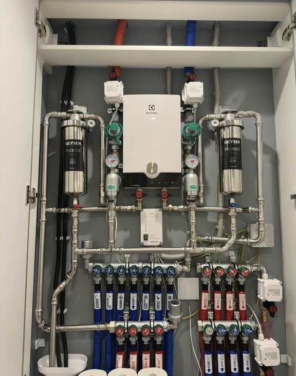 Сан. Узел. Душевая стойка c термостатом Jacob Delafon Atom, Мебель корпусная (шкаф над инсталляцией и тумба) , Шкаф под стиральную машину , Хозяйственный шкаф. Мозаика напольная