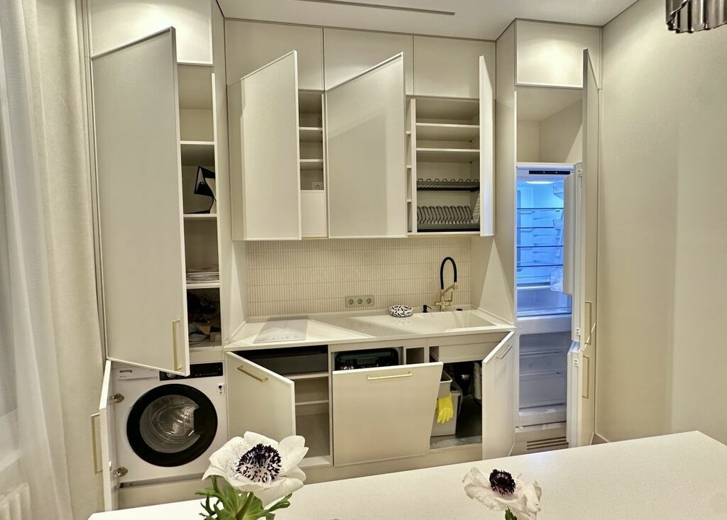 КУХНЯ- ГОСТИНАЯ: Кухонный гарнитур с островом , встроенный кухонный гарнитур, столешница кухни из искусственного камня Grandex , Диван, встроенная техника: варочная панель , духовой шкаф с функцией СВЧ, Измельчитель Bone Crusher , холодильник двухкамерный (Weissgauff), посудомоечная машина (Weissgauff), большой ЖК Телевизор Samsung., . Кондиционер ENERGOLUX INVERTER , Электрокарниз Dauerhaft, Чайник электрический. Вытяжка. Стиральная машина с сушкой (KWDI 12V75)