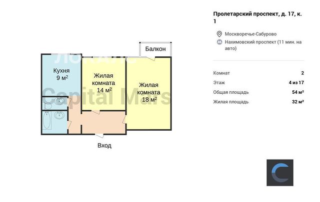 2-комнатная квартира: Москва, Пролетарский проспект, 17к1 (54 м²)