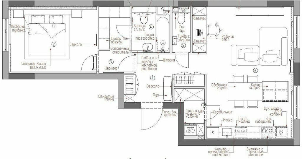 Помимо спальни и кухни-гостиной в квартире есть 2 сан. узла (мастер и гостевой), гардероб и постирочная - полностью оборудованные.