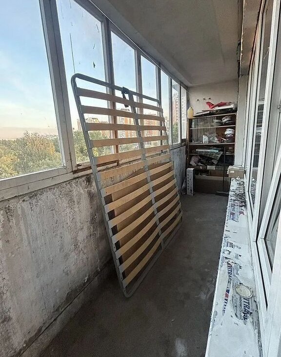 • мебель: в первой комнате большая кровать, во второй — диван; также на балконе хранится разобранная большая кровать Ноff, при необходимости её можно установить;
